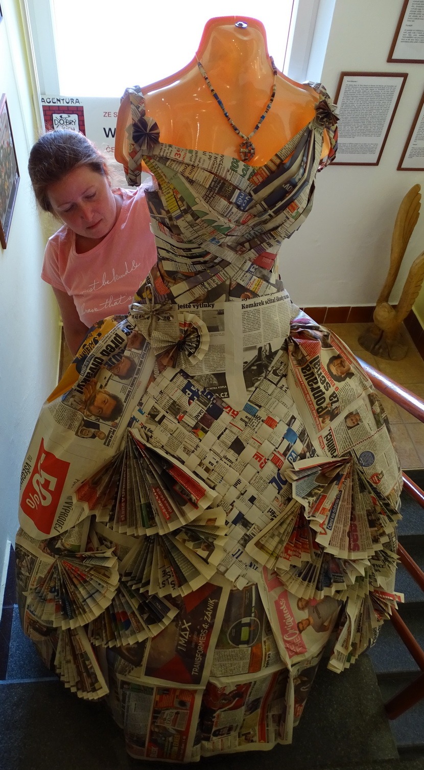 Pelhřimovské Muzeum rekordů má nové dámské šaty z papíru! Zdeňka Kršková, vychovatelka školní družiny ZŠ a MŠ T. G. Masaryka Rouchovany, vytvořila z novinového papíru čtvery dámské šaty v „životní“ velikosti, které byly využity pro výzdobu sálu na tamním školním plese. Jedny z nich byly nyní předány do expozice Zlaté české ručičky pelhřimovského Muzea rekordů a kuriozit. Jsou 162 cm vysoké a obvod sukně dosahuje cca 3 metrů. Přijdete-li se na ně do města rekordů podívat, uvidíte například i pozoruhodné svatební šaty z cukru (fondánu), které váží 70 kg.
